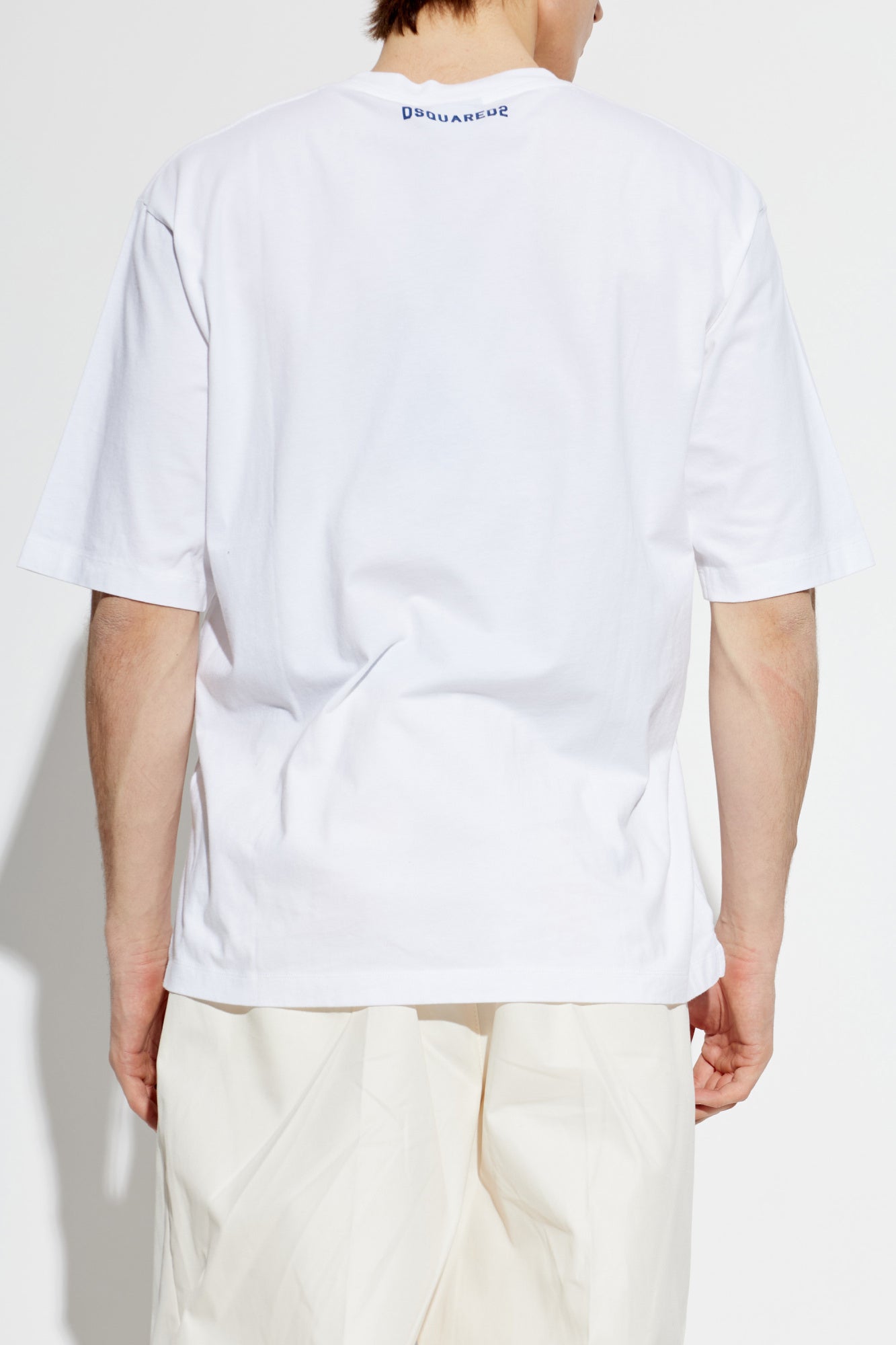 Discover the unique T-shirt with patch designed by the renowned designer Dsquared2. This white T-shirt dazzles with the subtle elegance of a classic, slightly oversized cut featuring short sleeves and a round crew neck. Carefully selected, premium-quality cotton guarantees exceptional softness and comfort, while its slightly denser weave ensures a perfect silhouette.
