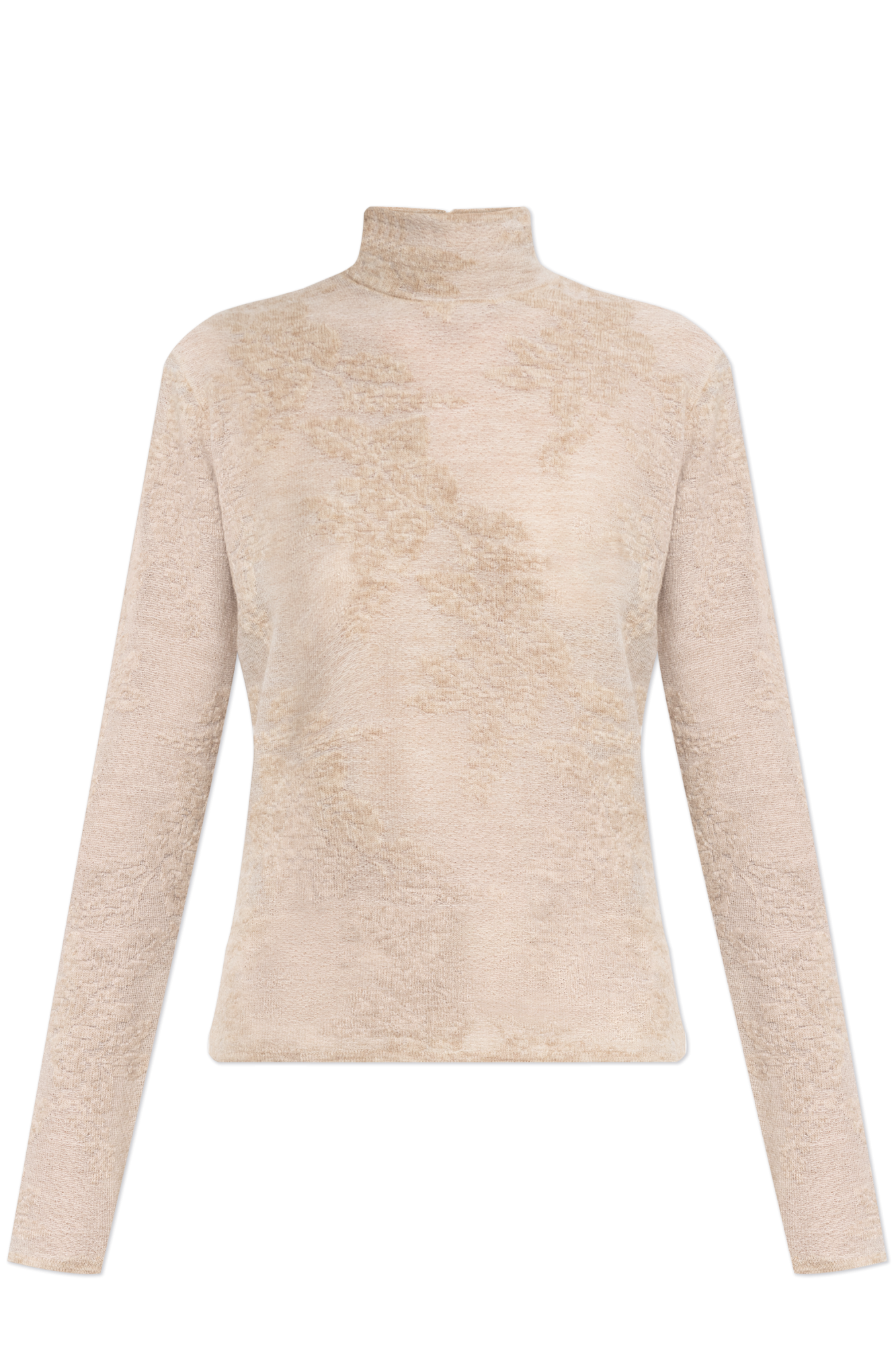 The floral motif in beige tones, extending across the entire surface of the sweater, breaks the classic austerity of the turtleneck, adding a touch of sophisticated charm. A subtle detail, such as the teardrop-shaped closure at the back of the collar with a transparent button, serves as a discreet accent of superior craftsmanship, distinguishing this design from everyday apparel.