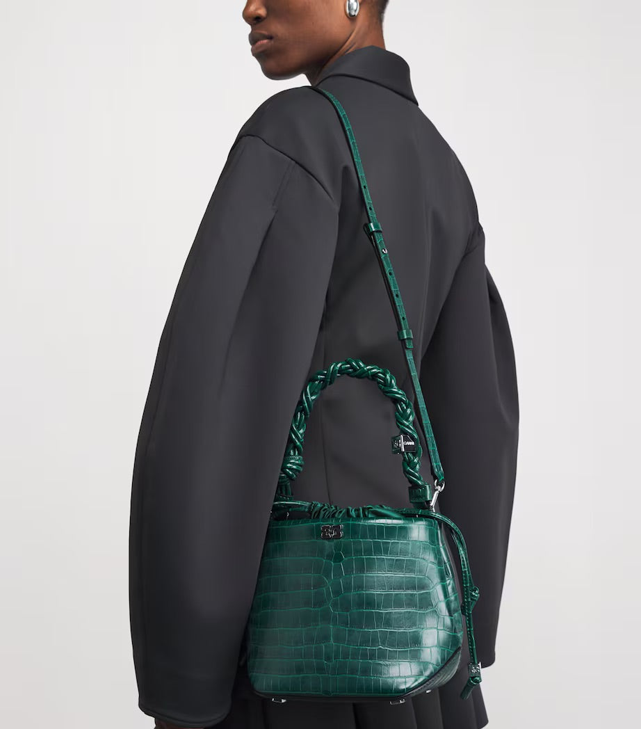 This bag features a braided top handle with knot detail and an adjustable and removable strap. The bag has a drawstring pouch, an embossed logo on the back, and an internal flat pocket.